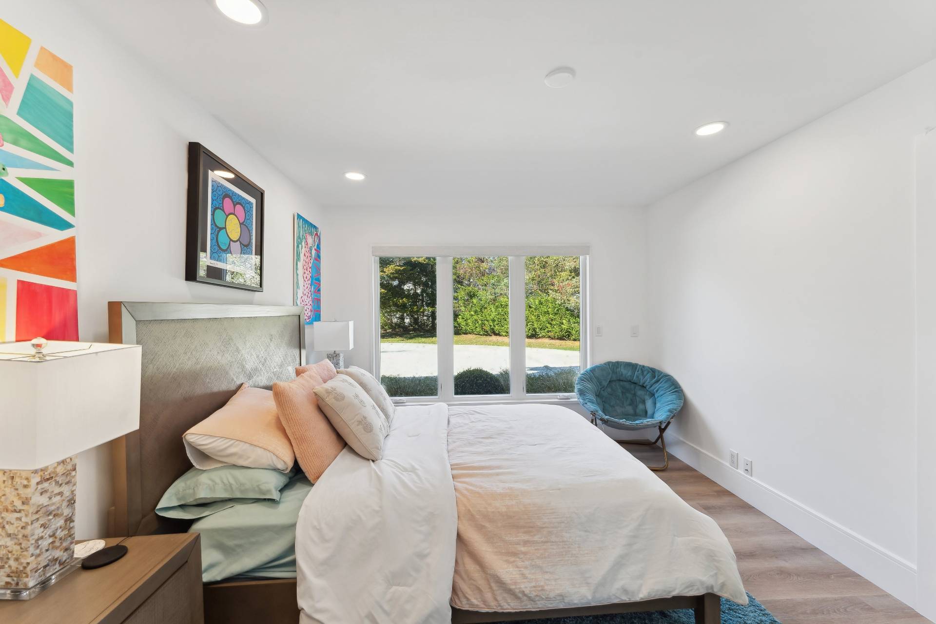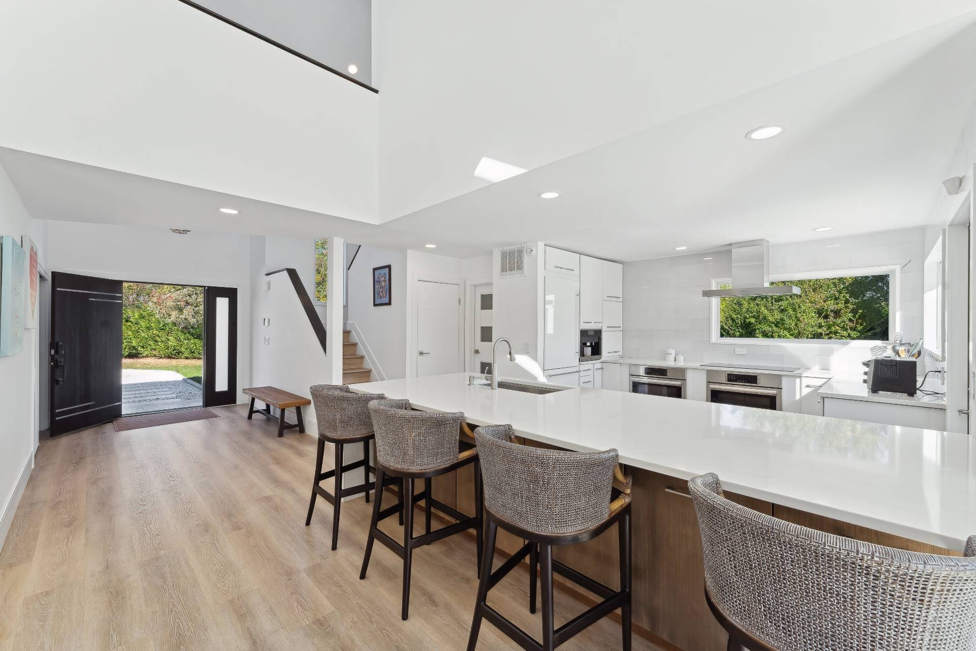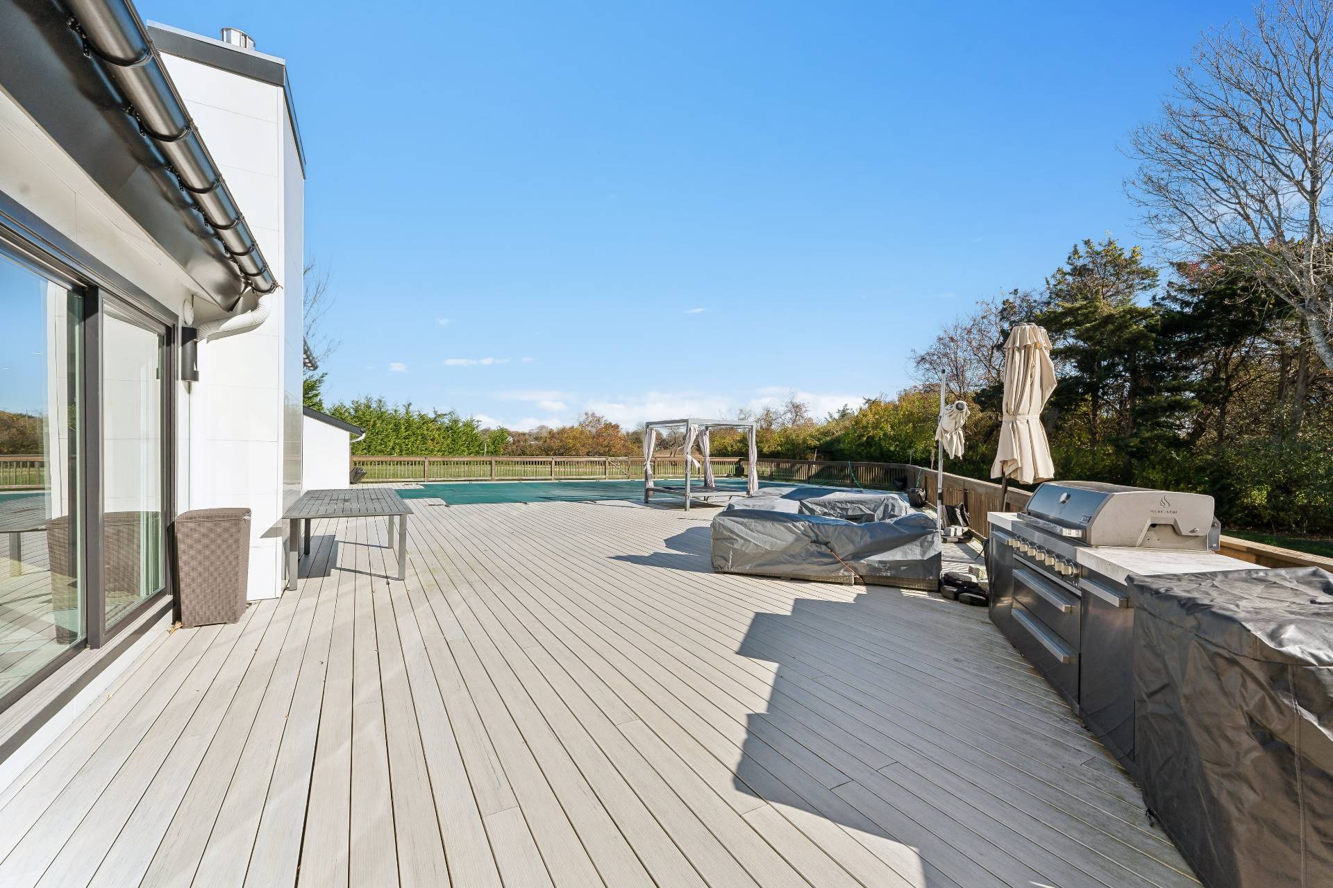 Fully renovated 4-bedroom, 4-bath home set on 2.3 private acres with water views. The property is designed for both everyday living and entertaining, with a private dock, heated pool, sports court, and a large deck. The main living area is open and bright with southern exposure, connecting the kitchen, dining, and living spaces directly to the pool deck. The first floor includes three guest bedrooms and three full baths. Upstairs, the primary suite features a walk-in closet, a spa-style bathroom with soaking tub and sauna, and a private balcony with water views. Located just minutes from the Village of Westhampton Beach and nearby ocean beaches.